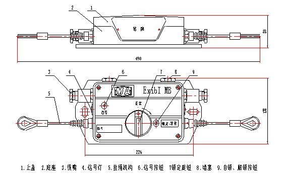 | a、动作力:40~120N; b、动作方向:双向动作; c、复位力:≤10N; d、动作行程:8mm~20mm; e、额定工作电压:DC12V,最大工作电流:≤0.1A; f、引入电缆最大外径:Φ10mm; g、出线喇叭口数量:2只(备用2只); h、动作性能:拉动闭锁开关任意一端钢丝绳,闭锁开关受动作力后应立即动作并锁定, 同时有警示牌指示,必须在人工复位后方可解锁。 |