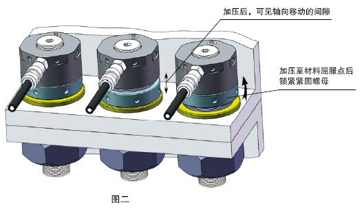 d、将螺杆旋入液压螺母螺孔后安装到设备上并旋紧螺母,(安装时,紧固螺母朝设备方向),用力扳紧压靠设备,使液压螺母端面与设备端面之间基本无间隙。见图二所示 e、连接快速接头,使用动力源进行加压,超高压油泵产生的压力油通过超高压软管逐步进入液压螺母的油腔,螺栓在弹性变形范围内被拉伸长,使液压螺母的缸体和活塞逐渐分离,通过螺纹拉伸高强度螺栓,在液压螺母缸体和紧圈螺母间形成一定的间隙,见图二所示,旋转紧圈螺母贴紧缸体,保证高压泵卸压后高强度螺栓仍处于拉伸状态,此时切忌液压螺母活塞伸出超过最大行程,防止活塞脱缸。待液压螺母达到预紧力后,动力源保持稳定状态,停止加压。 |