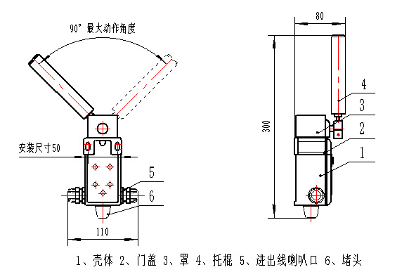| a、触杆的动作力: 20N~100N; b、动作角度:30°±3°(可调、双向)。 c、复位角度:15°±5°; d、极限角度:不小于70°; e、接点容量:DC24V/1A(阻性负载) f、引入电缆最大外径:Φ12mm; g、出线喇叭口数量:2只; h、动作性能:跑偏传感器受动作力作用,托棍转动至动作角度时应立即动作,常开接点闭合,常闭接点断开,动作力撤除托棍自动返回原位经过复位角度时立即恢复,常开接点断开,常闭接点闭合; |