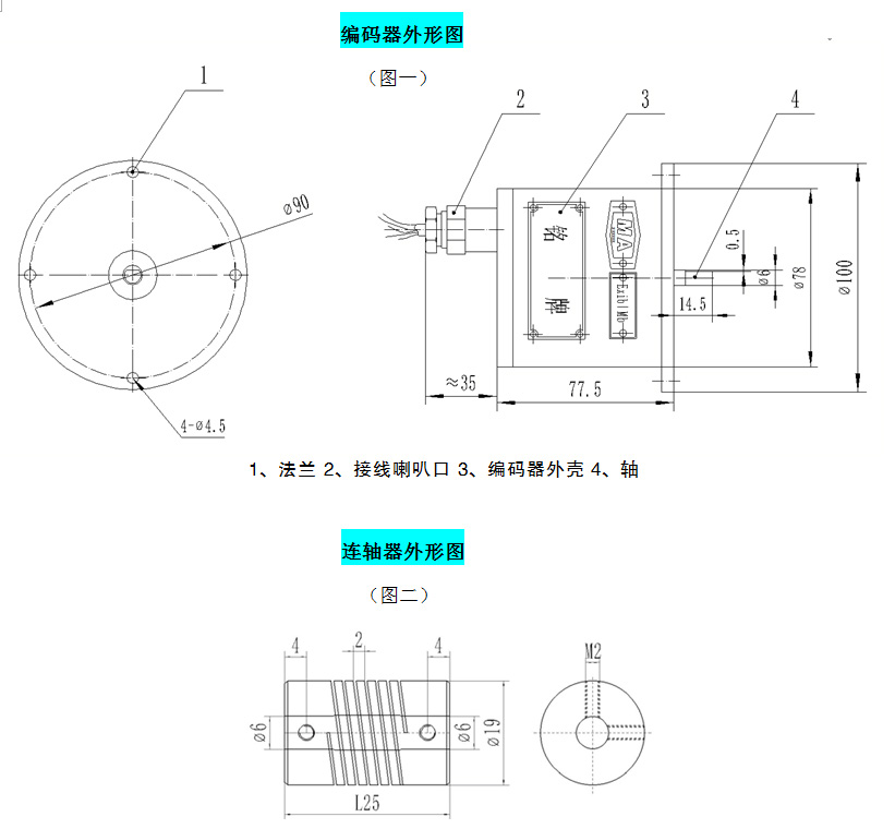 | a、外形尺寸:φ100mm×78mm; b、重量:3 kg; c、法兰安装尺寸:固定螺钉孔中心距为φ90mm(根据用户需要可定制); d、螺钉:M4×20(4个螺钉)。